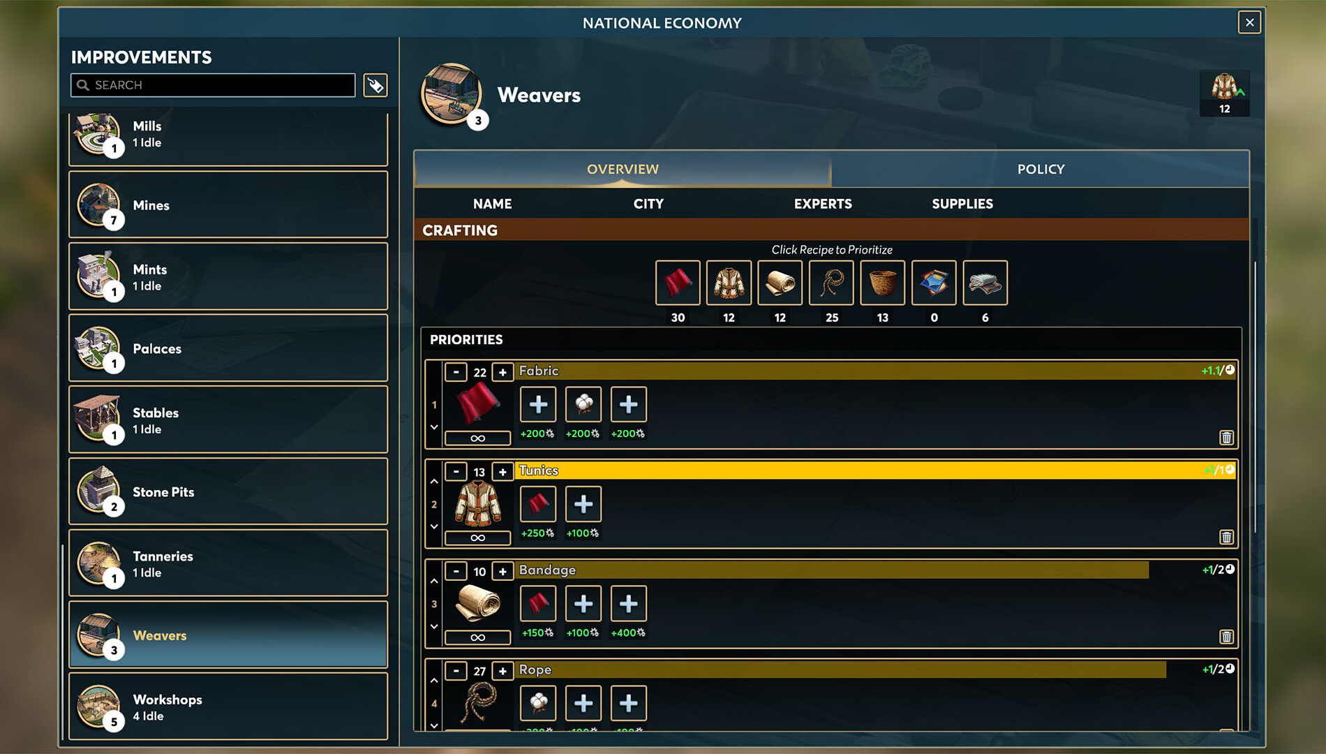 En la Versión 2.0, puedes dejar que el Administrador de Tienda IA (taller, fábrica o telar, por ejemplo) se encargue por ti, incluyendo la configuración de prioridades y cuotas. Esto es muy útil cuando conquistas una ciudad masiva con una docena de mejoras: en lugar de gestionar múltiples talleres, simplemente presionas un botón y dejas que la IA se encargue.